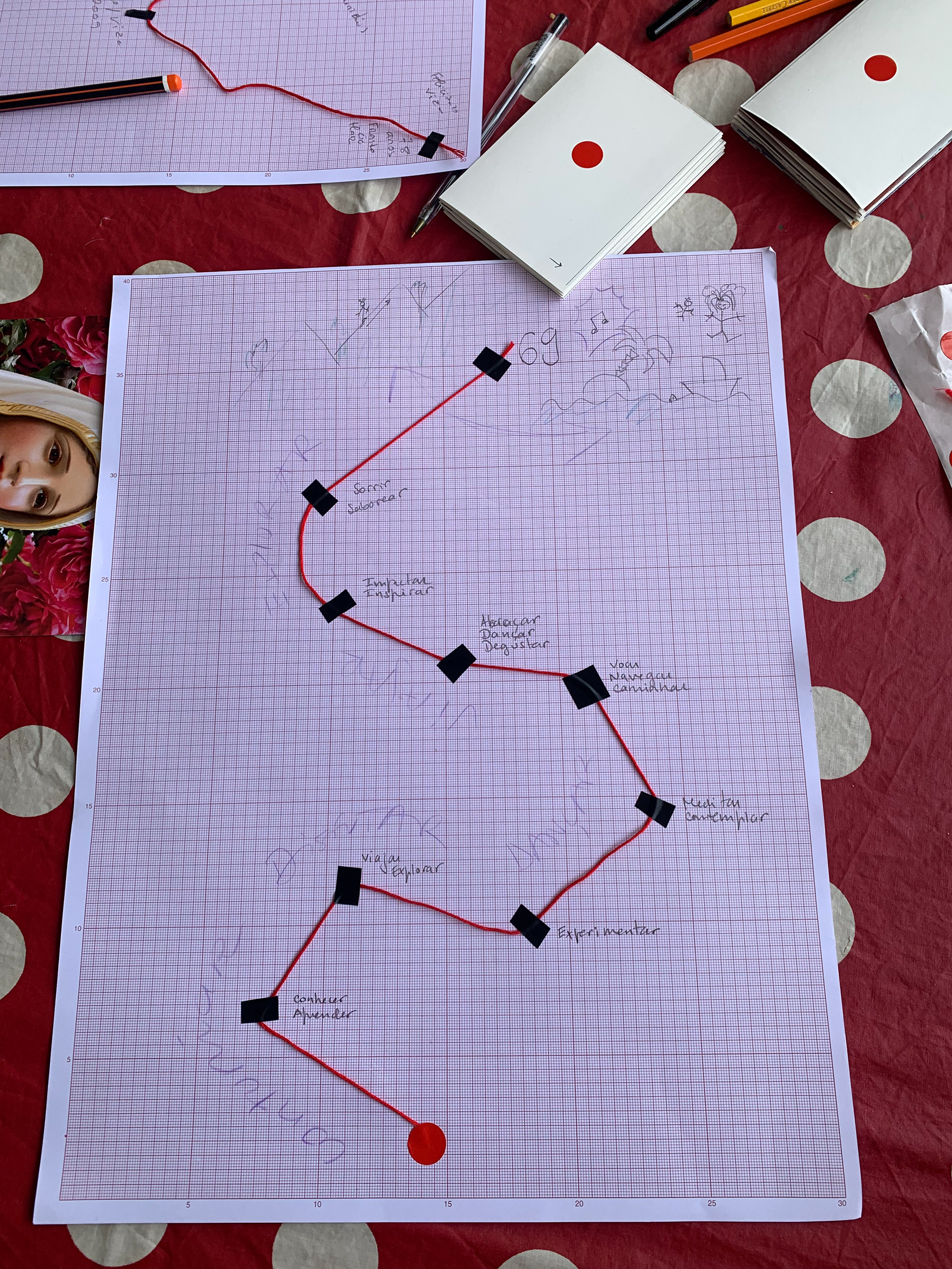 Temos o ESTOU AQUI, o VIR e o IR. O Estou aqui é a bola vermelha e o que desenharem será com lápis de grafite, o Vir de uma cor e o Ir de outra. O Vir é de onde venho até chegar aqui, o Ir é para onde vou ao sair daqui e para onde me sonho ir.