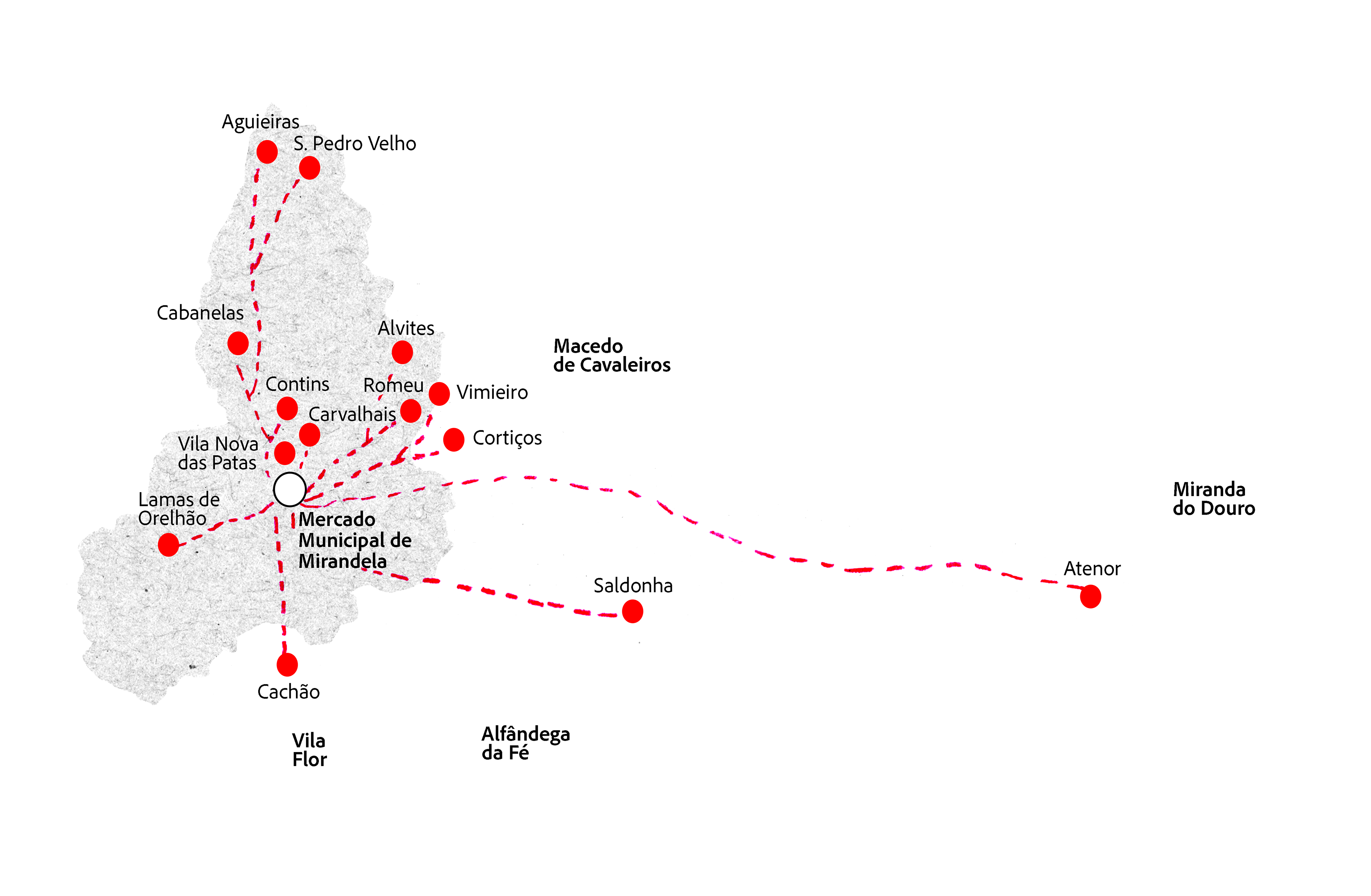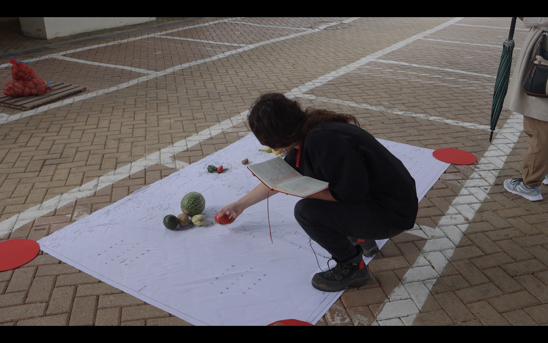 With a map* on the floor of Mirandela Market occupying one of the circulation areas, we began researching the origin of the products sold at the market stalls... At the stalls, we identified fruits and vegetables and asked the sellers for their help. We borrowed a vegetable or fruit to place on the map in the country or area of origin... one of the most frequent reactions was: ‘This vegetable/fruit is from here, from my garden.’ Our response was: "Yes!... We are trying to find out where they came from, to know their origin... when they arrived in Portugal... From what latitudes were they brought, how did they become part of the diet of this region or country, before being produced in your garden..."